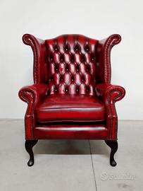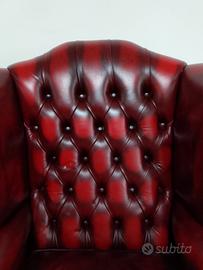 Poltrona chesterfield ( chester ) modello Queen Anne vintage inglese originale in pelle rosso bordeaux anticato.