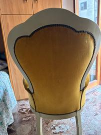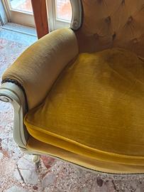 Vendo elegante poltrona in stile classico/vintage, con struttura in legno laccato color avorio e rivestimento in velluto color senape con lavorazione capitonné sullo schienale.