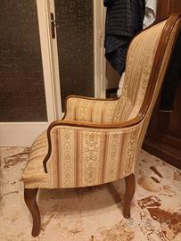 Elegante poltrona degli anni ’90 realizzata in stile classico, con struttura in noce massello e seduta imbottita rivestita in raso damascato a righe nei toni del crema, oro e rosa antico.