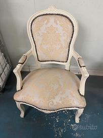 Vendesi poltrona in stile classico, ideale per chi ama l'arredamento Shabby Chic. La struttura in legno è rifinita con una laccatura color crema arricchita da intagli floreali sulla testata e sul fregio inferiore. tessuto damascato con motivi floreali nei toni dell'oro e del beige. Ritiro a Pero (Milano)