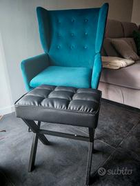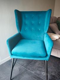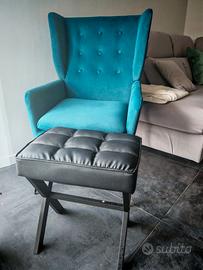 Nuova, comprata a novembre e mai utilizzata.... vendo per trasloco e cambio arredo La poltrona è colore blu pavone in velluto Il poggiapiedi nero tipo ecopelle