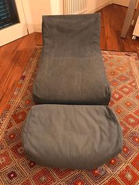 Poltrona con poggiapiedi, sagomabile, interno in polistirolo, rivestimento in tessuto color jeans completamente sfoderabile e lavabile, come nuova, mai usata (base cm100x80 e poggiapiedi cm50x80). No spedizione. Consegna a Bergamo e prima periferia.