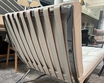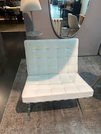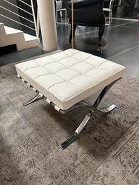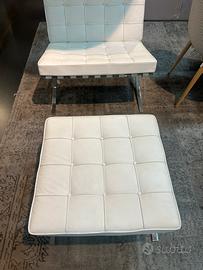 Iconica poltrona con pouf Knoll mod. Barcellona progettata da Mies Van Der Rohe in pelle bianca con struttura cromata.