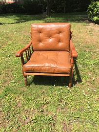 Poltrona Country con struttura in legno e cuscini in similpelle marroni, larghezza 70 cm, profondità 75 cm, altezza 79 cm, come nuova, veramente ottime condizioni.