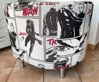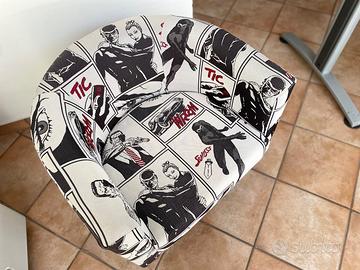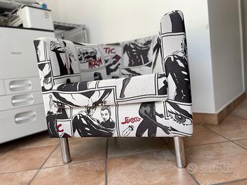 🎭 Poltrona d’autore unica nel suo genere, rifoderata artigianalmente con tessuto ispirato ai fumetti noir anni ’50, perfetta per chi cerca un arredo fuori dagli schemi.