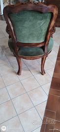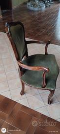 Poltrona antica in stile Luigi Filippo, probabilmente realizzata in legno di noce con un rivestimento in velluto verde.