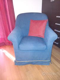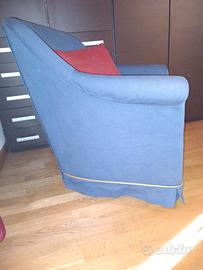 Poltroncina da camera in tessuto blu con rifiniture giallo ocra, completamente sfoderabile e lavabile in lavatrice. Con rotelline per facilitare lo spostamento. Misure: 85 x 75 profonda 68. Euro 55,00 prezzo leggermente trattabile . No spedizione.