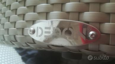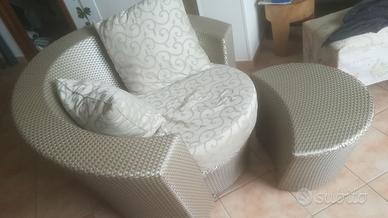 La poltrona è come nuova, tenuta sempre in casa anche se disegnata per esterni. Viene venduta con 2 cuscini e poggia piedi e con inoltre 3 fodere in totale, una bianco-panna (originale DEDON) e due extra, damascate tono su tono. Poltrona: H: 76 - L: 122 - P: 101 Poggiapiedi: H: 40 - W: 65 - D: 40 La collezione Hemisphere è su ruote piroettanti, che consentono alla poltrona di ruotare di 360 e seguire il sole. Colore platino L’ arredamento DEDON è disegnato per giardini, terrazze, piscine. Tutti i prodotti sono intrecciati a mano con una fibra unica HULARO- materiale sintetico sviluppato e registrato in Germania. A differenza delle fibre naturali, è estremamente resistente al sole (raggi UV) e ai microorganismi. Impermeabile (acqua marina, dolce e clorata) e resistente agli agenti atmosferici.