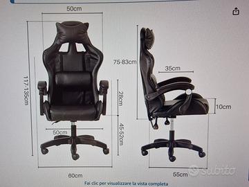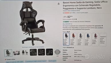 Vendo a metà prezzo rispetto a quello Amazon, consegna a mano a Milano in zona Stadera/Pezzotti caratteristiche prese dalla pagina Amazon: DESIGN ERGONOMICO – Rivestita in pelle sintetica, la sedia è confortevole e traspirante; la seduta è imbottita con SOFT FOAM indeformabile di 10 cm di spessore. La sedia da gaming è perfetta per ogni esigenza: seduta ampia, altezza regolabile tra 42 cm e 52 cm, ergonomica e confortevole anche dopo lunghe ore di lavoro o di gioco. Il design ergonomico dello schienale della poltrona si adatta perfettamente alla struttura del corpo umano e contribuisce a un'esatta posizione cervicale e lombare. REGOLABILE - La sedia da gioco ha uno schienale regolabile tra da 90° a 120°. Semplici comandi consentono di regolare l'angolo di reclinazione dondolando in avanti o all'indietro. Grazie al sollevatore pneumatico che consente di regolare l'altezza ed al supporto lombare, è possibile adattarsi a diverse altezze del tavolo e posizioni di seduta. La sedia può essere ruotata di 360° per soddisfare le diverse esigenze di lavoro e di gioco. ROBUSTA E PRATICA - La robusta struttura in metallo rende questa Poltrona da ufficio Baroni Home un oggetto indispensabile per le vostre serate di gioco. È dotato di una base a 5 rotelle che offre la giusta stabilità e fermezza. I braccioli, il sedile e lo schienale sono imbottiti con una schiuma speciale chiamata SOFT FOAM, che sostiene gli avambracci, la schiena e il collo durante una lunga sessione di gioco. La poltrona può sostenere fino a 200 kg MISURE - La sedia è regolabile da 42 cm da terra a 52 cm di altezza; lo schienale è regolabile da 75 cm a 83 cm ed è inclinabile fino a 120°. La profondità della seduta è di 55 cm e la larghezza di 50 cm. Dotato di un cuscino di supporto lombare e di un cuscino per il collo che possono essere spostati verso l'alto o verso il basso o rimossi. Altezza totale: da 117 a 135 cm. Istruzioni di montaggio e materiale di installazione inclusi.