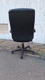 Poltrona girevole da ufficio con ruote in similpelle nera reclinabile con braccioli rivestiti. Leggermente usurata in qualche punti ma molto comoda e confortevole.