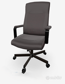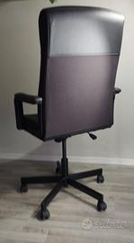 In materiale simil pelle color marrone testa di moro, 70 cm ingombro rotelle, altezza poltrona max 123 cm. Lo schienale e la seduta sono perforati per una maggiore traspirazione. I braccioli confortevoli, imbottiti pensati per supportare gli avambracci. Meccanismo di inclinazione manuale dello schienale, sedile regolabile in altezza, funzione di sicurezza per blocco rotelle.