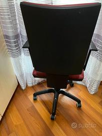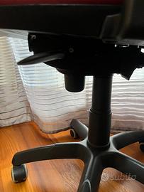 Poltrona da ufficio materiale ecopelle colore rosso con le seguenti funzionalità: -Braccioli confortevoli -Girevole – schienale regolabile – seduta regolabile in altezza -ruote per parquet già installate. Sedia usata ma in perfette condizioni.
