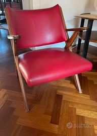 Design: Presenta uno stile modernista con una struttura a forbice in legno ( faggio o noce) e rivestimento in similpelle (chiamata anche skai) di colore rosso corallo.