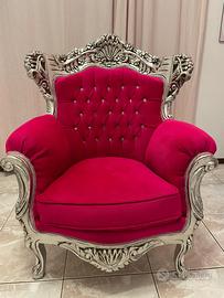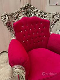 Sedia realizzata in legno verniciato in argento e rivestita in tessuto fucsia.