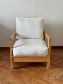 poltrona dal design nordico molto bella e comoda in perfette condizoni con struttura in legno di betulla e due cuscini imbottiti in tessuto color bianco.