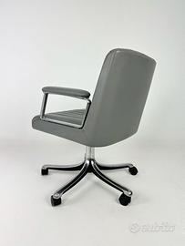 Poltrona Tecno modello P126, disegnata da Osvaldo Borsani, fondatore dello storico marchio del design italiano, nei primi anni 60. La poltrona e i braccioli sono rivestiti in pelle grigia; struttura in alluminio con l’inconfondibile base a 5 razze tondeggianti disegnata da Borsani. Seduta non regolabile in altezza. Nella versione con schienale basso. La poltrona è in buone condizioni, con lievi segni del tempo come da foto.