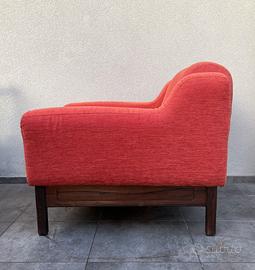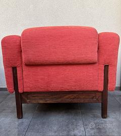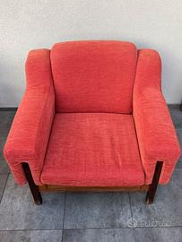 Poltrona interamente imbottita e rivestita con tessuto color corallo su struttura in massello di palissandro. Ottime condizioni Italia 1970 Misure 96 x prof. 95 h schienale 80 per chi fosse interessato al momento a disposizione anche la poltrona gemella e anche un divano a 4 posti da mt. 2, 70. Per info scrivete grazie