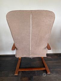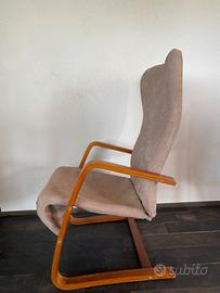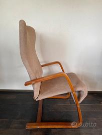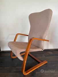 Poltrona ergonomica imbottita, di design, nello stile di Alvar Aalto. Vintage, in ottimo stato, struttura in legno color noce e imbottitura color tortora.
