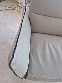 Vendo bellissima poltrona di pelle spessorata di colore grigio. Ha i bordini a contrasto di colore nero. Il pouf poggiapiedi è di vellutino microfibra nero , come i bordini, e misura 1m per 1 m .