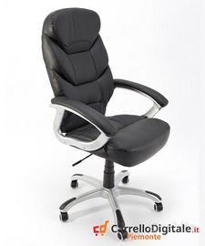Comodissima Poltrona ergonomica girevole in Ecopelle. -Prezzo: 99 euro IVA inclusa -Trasporto GRATIS in tutta Italia -Possibilità di pagare alla consegna con 6 euro in più Ideale per riunioni e conferenze in ufficio, ma anche per la casa e lo studio in cameretta, questa poltrona direzionale dispone di un pistone a gas per regolare l'altezza della sedia a livello della scrivania e di un sistema dondolo per regolare la postura. Presenza di microfori nella parte centrale della seduta e della spalliera per permettere una migliore areazione. Realizzata con ottimi materiali, questa comoda poltroncina presidenziale può reggere carichi molto pesanti. La qualità dell'ecopelle utilizzata per il rivestimento è ottima ed è caratterizzata da morbidezza al tatto, traspirabilità, idrorepellenza, resistenza all'usura e facile pulizia. A differenza dei rivestimenti di altre poltrone che troverete in commercio, non avrete la sensazione di essere seduti sulla plastica o su una pelle di scarsa qualità. Abbiamo preferito ecopelle di altissima qualità al posto di una pelle scadente, dura e quindi sgradevole al tatto, tendente a macchiarsi, non traspirante e che avrebbe avuto come unico vantaggio quello di una migliore resa di marketing. Le nostre comode e anatomiche poltrone sono nuove e mai state usate, con garanzia e regolare documento fiscale. SCHEDA TECNICA: - Colore Seduta : Nero - Altezza Regolabile a Gas - Poggiabraccia Imbottiti - Supporto lombare - Seduta e spalliera con microfori per permettere la traspirazione - Meccanismo a dondolo regolabile e bloccabile - Ruote gommate per una maggiore scorrevolezza - Altezza Spalliera: 78cm - Larghezza Spalliera: 52cm - Profondità Seduta: 51cm - Larghezza Seduta: 52cm - Larghezza Seduta con braccioli: 69cm - Altezza Spalliera da terra min/max: 122/111cm - Altezza Seduta da terra min/max: 55/44cm - Base in nylon con 5 Ruote - Diametro base con ruote: 75cm sedie imbottita poltroncine riunione conferenza Contattaci subito per avere
