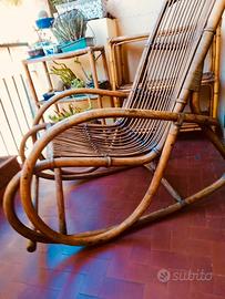 Poltrona dondolo in bambu sempre mantenuta con vernice flatting in discreto ordine Dimensioni: H mt 1 - Lunghezza cm 1,50 - Larghezza cm 57 - Profondità seduta cm 56.