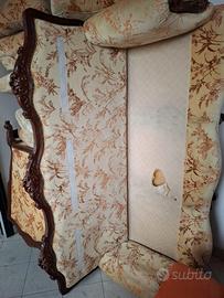 Vendesi poltrona e divano vintage in stile classico con struttura in legno intagliato e imbottitura in velluto decorato. Ideale per arredamento elegante, vintage o shabby chic. Il divano presenta segni del tempo e potrebbe necessitare di piccoli interventi di restauro o pulizia.