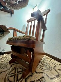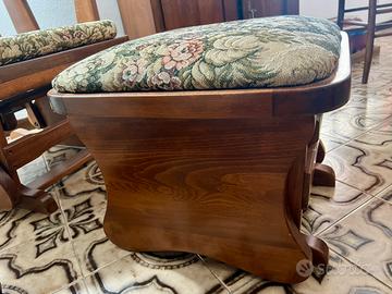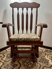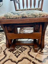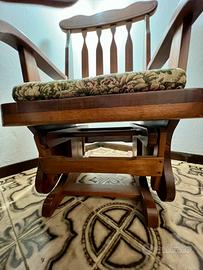 set composto da una poltrona a dondolo country e un poggiapiedi coordinato in legno massiccio di noce e cuscini con una classica fantasia floreale. modello "glider" o a dondolo oscillante, spesso utilizzato come sedia da allattamento o da relax per il suo movimento fluido. Pezzi inclusi :Il set mostrato è una rara versione a due pezzi, dove anche lo sgabello poggiapiedi è dotato di un meccanismo a dondolo sincronizzato con la sedia. Dimensioni poggiapiedi 50x50x35 cm. Dimensioni poltrona 70x65x120 cm.