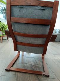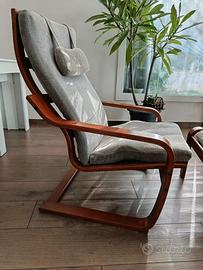Vendo poltrona e poggiapiedi poang di Ikea. color ciliegio e rivestimento grigio. il rivestimento è datato,ma le strutture di legno sono in ottimo stato.