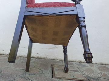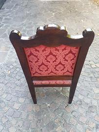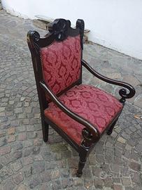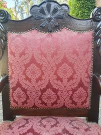 Elegante poltrona dallo stile classico, probabilmente di fine '800 o inizi '900, in stile Luigi Filippo o neorinascimentale. La poltrona è in legno intagliato a mano con motivi floreali e dettagli decorativi. Braccioli mossi e torniti. Rivestimento in tessuto damascato rosso.