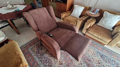 Poltrona motorizzata per anziani e disabili made in Italy a 2 motori con kit roller, 4 ruote azionabili dalla pedana posteriore, per lo spostamento della persona. Poltrona con schienale bergere alza persona azionabile con telecomando prodotta con tessuti idrorepellenti.