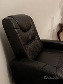 Poltrona elettrica in eco-pelle, antimacchia, colore "testa di moro" (marrone scuro): dotata di trasformatore elettrico e telecomando multifunzione, reclinabile, con lo schienale reclinabile fino a posizione sdraiata, poggiapiedi. NUOVA, mai usata per impedimenti familiari.