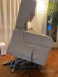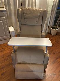 Poltrona elevabile quasi nuova della Global Relax modello Savoy. con rotelle. Con schienale e seduta imbottite a densità differenziata. Struttura in acciaio verniciato. Braccioli estraibili per passare dalle porte e inserire il tavolino. Tessuto tecnico beige antimacchia e idrorepellente. Fornisco anche il kit copripoltrona lavabile. Tra le foto inserisco la fattura di acquisto nella quale ci sono tutte le caratteristiche e l'importo reale da me pagato. Con vibromassaggio e magnetoterapia.