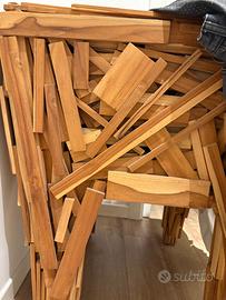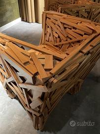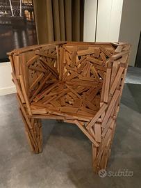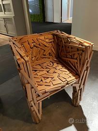 La poltrona Favela, prodotta da Edra a partire dal 2003, rappresenta l’esempio più celebre del caratteristico stile di “design povero” dei suoi creatori, i fratelli brasiliani Fernando e Humberto Campana. Concepita per la prima volta nel 1991 e realizzata inizialmente con materiali riciclati, la poltrona Favela è prima di tutto un piccolo saggio di arte concettuale, ispirata all’abitudine degli abitanti delle favelas brasiliane di costruire con materiali di scarto le proprie abitazioni e i propri arredi. La poltrona è costituita da tanti piccoli listelli in legno naturale inchiodati a mano in un lavoro artigianale che fa sì che ogni poltrona sia un pezzo unico e presenti un assetto differente da tutte le altre, con listelli di dimensioni diverse inchiodati ciascuno secondo un proprio angolo L.67 x P.62 x H.74 cm Altezza Seduta 40 cm La poltrona è in perfette condizioni Disponibile per la spedizione con prezzo da concordare dopo preventivo del corriere