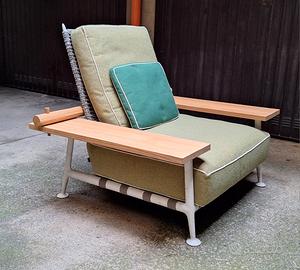 Il sorprendente comfort è garantito dai generosi cuscini per seduta e schienale con imbottitura in SoloSoff(C), un prodotto a base di fibra di poliestere soffiata e memory foam, e dallo schienale reclinabile in due posizioni grazie a un meccanismo manuale ispirato all'architettura asiatica: un palo di sostegno in massello di teak, lavorato per apparire come un ramo, da bloccare in posizione per mezzo di due chiodi in legno. Completano la collezione una poltrona e un tavolino a due altezze.