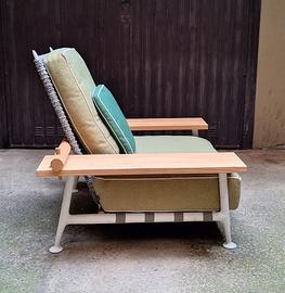La poltrona ha forme organiche - come il basamento in pressofusione di alluminio - ed elementi materici che celebrano l'armonia con la natura, come il bracciolo in massello di teak con finitura sabbiata, dall'effetto grezzo.