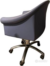 Sedia da scrivania ufficio Poltrona Frau by Luca Scacchetti mod. Sinan in pelle lilla, prodotta negli anni 90, ha una seduta con diverse declinazioni ed utilizzi, dal design elegante e senza tempo. Poltrona girevole regolabile in altezza con pompa a gas e meccanismo di oscillazione regolabile e bloccabile. La seduta è sostenuta da una base in alluminio con ruote. La scocca, infine, è imbottita e rivestita in pelle Frau lilla.
