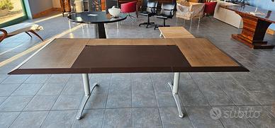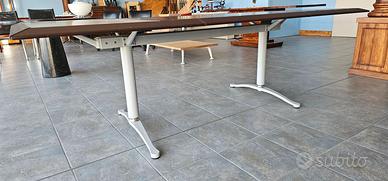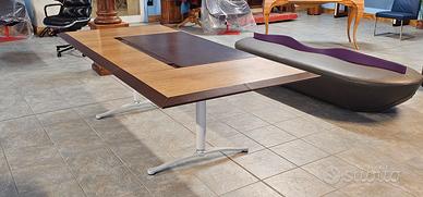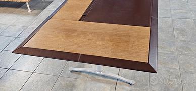 Oggetto: President Desk Descrizione del prodotto Un sistema studiato e flessibile per arredare uffici direzionali, sale riunioni e consiliari. Artù utilizza pelle e legni di alta qualità, lavorati a mano con la tipica qualità e attenzione ai dettagli Poltrona Frau. La collezione comprende tavoli da conferenze, tavoli da riunione, scrivanie e armadi che forniscono un'ampia gamma di mobili per un moderno ufficio direzionale. I piani dei Meeting Table poggiano semplicemente su una trave in acciaio collegata alle gambe. La President Desk è la più sofisticata della gamma Artù. Pur utilizzando lo stesso sistema di montaggio dei ripiani, vanta un piano più ampio, rivestito in pelle e leggermente imbottito, con due aperture per consentire il passaggio dei cavi. Il piano Executive Desk è fissato direttamente sulle travi. I ripiani sono sostenuti da due gambe in alluminio con finitura grigia o rivestite in pelle, dotate di base a ponte per garantire maggiore stabilità. Le gambe cilindriche di tutti gli arredi Artù sono dotate di anello di sostegno rastremato, le gambe dei tavoli possono ospitare anche un moderno sistema di gestione dei cavi. I piani sono rifiniti in wengè, i piani sono sempre bordati in pelle. H73x230x110 cm. Design Michele De Lucchi