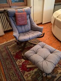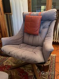 Poltrona Frau, modello Viking. Con poggiapiedi; legno multistrato curvato tinto noce, imbottitura in espanso, rivestimento in pelle.