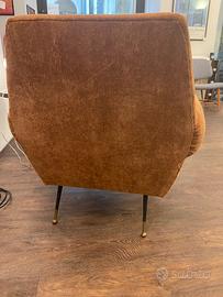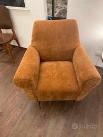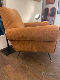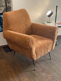 Poltrona Gigi Radice, rinnovata con imbottitura e rivestita in ciniglia dal caldo colore. Piedini in ottone. Visionabile a Genova (centro)