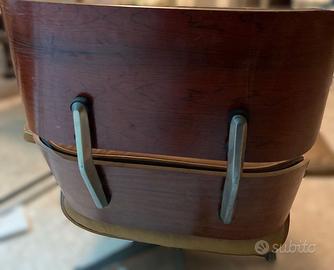 Condizioni vintage: il legno presenta alcuni segni del tempo, piccole scheggiature e graffi soprattutto sui bordi dello schienale, e la pelle mostra una normale usura omogenea (patina d’epoca), ma l’insieme è ancora molto bello e perfettamente utilizzabile. Proprio questa patina la rende un pezzo molto interessante per collezionisti e appassionati di design.