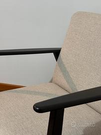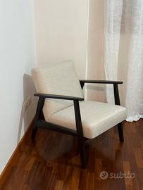 Struttura in legno nero opaco con linee pulite e solide, seduta e schienale imbottiti in tessuto color beige chiaro. Comodissima, perfetta sia per salotto che per angolo lettura o camera.