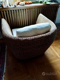Vendo poltrona in fibra naturale intrecciata , in buone condizioni. Completa di seduta e schienale imbottiti con cuscini sfoderabili. Prezzo trattabile Ritiro a carico dell’acquirente. Vendita tra privati, vista e piaciuta. Prezzo trattabile