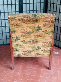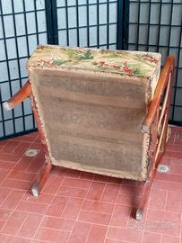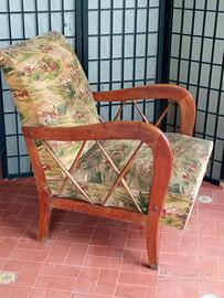 Poltrona in legno e stoffa anni '50 nello stile dell'Arch. Paolo Buffa (1903 - 1970), uno dei grandi designer del XX secolo sebbene un po' sconosciuto al grande pubblico. Struttura sana e solida, con il tessuto (velluto) originale, ma usurato per cui è da valutare la ritapezzatura. Piccoli segni di normale usura. Dimensioni: altezza cm 82 - larghezza cm 60 - altezza schienale cm 55 - profondità seduta cm 52 - larghezza seduta cm 48 - altezza della seduta cm 36 .