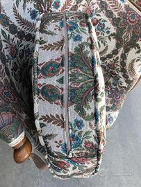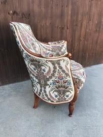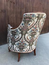 Antica poltrona in legno e tessuto Molto bella, cuscino sfoderabile. Ideale per camera da letto o salotto. Misure: cm 67 x h90 seduta h 43 Ritiro a carico dell' acquirente. Contatto tramite Subito.
