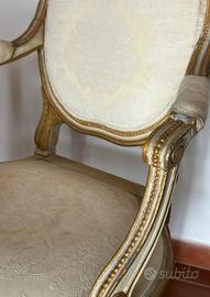 Coppia di poltroncine classiche in stile Luigi XV Struttura in legno con dettagli dorati e intagli decorativi. Rivestimento in tessuto damascato chiaro. Sono state conservate con cura, presentano normali segni del tempo che ne esaltano il fascino vintage. Perfette per arredare salotti, camere da letto o ambienti eleganti. * Vendibili anche singolarmente su richiesta.