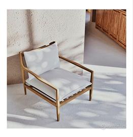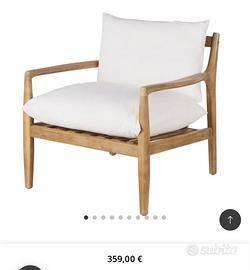 Poltrona in legno di acacia con cuscini bianchi in misto lino. Nuova mai utilizzata Modello indiana di Maison du monde Prezzo in negozio 359 euro Lunghezza 67 cm Altezza 71 cm Profondità 79 cm