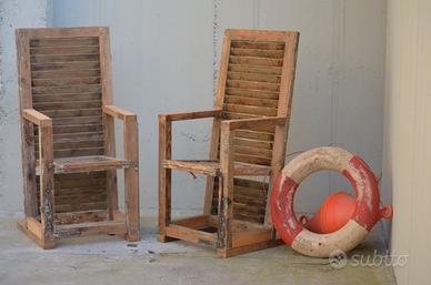 vendo 6 poltrone in legno massello di ottima qualità, realizzate in stile shabby dal recupero di persiane liguri; molto solide e resistenti ideali per spazi esterni (portici, terrazze, giardini ecc..) il prezzo è al pezzo; vendita anche separatamente; ritiro sul posto o mediante corriere a vostro carico