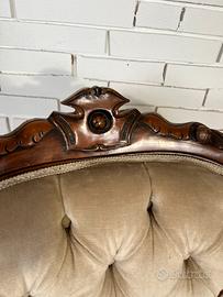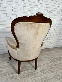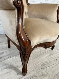 Elegante poltrona in mogano con raffinati intagli, rivestita in velluto beige capitonné.