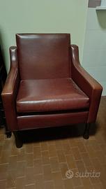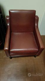 Elegante poltrona imbottita in stile classico, rivestita in finta pelle (o similpelle) color bordeaux scuro. La struttura è squadrata e solida, con braccioli alti leggermente stondati e schienale dritto. La seduta è ampia e comoda, con un cuscino spesso integrato nella base.