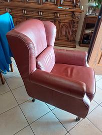 Poltrona pari al nuovo colore rosso bordeaux piedi in legno massello misure: alt 103 largh 87 prof. 75 con cuscino zona lombare sempre in pelle. Dotata di cerniere lampo per essere sfoderata.. prezzo trattabile